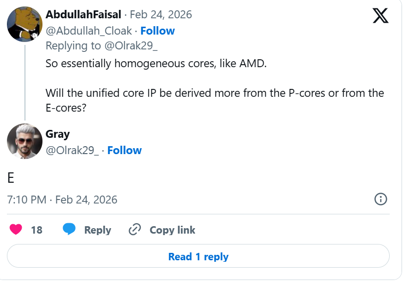 此外,Olrak29_认为Intel的统一内核实际上源于E核,如果这个说法属实,那意味着Intel未来会放弃此前的P核设计,因为这种核心虽然性能强,但功耗大、散热容易失控,类似之前的14900K那样,而且不适合移动平台。
