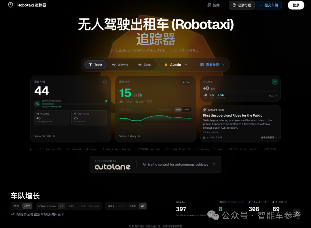 这让每个人都能通过网页看到特斯拉、Waymo和Zoox等自动驾驶公司在不同地区的车队情况。以特斯拉为例,追踪器显示特斯拉目前已经部署了近400辆Robotaxi,其中只有8辆是无人驾驶(UNSUPERVISED),有89辆部署在了奥斯汀,当地打特斯拉Robotaxi预计需要等15分钟。