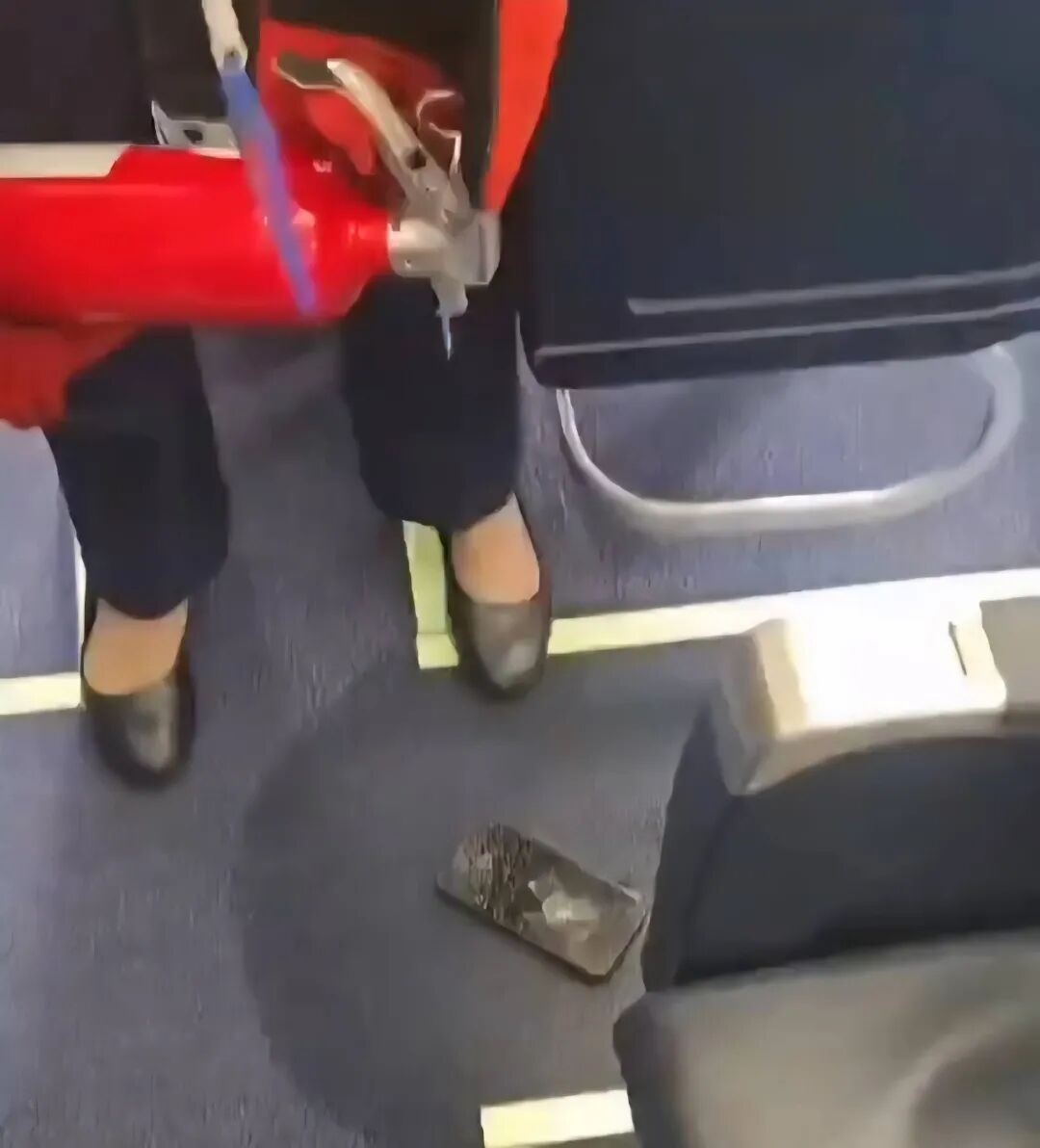 现场视频显示,手机已经碎裂,有空乘人员拿来灭火器,对手机实施了灭火,起火手机的品牌暂无披露。