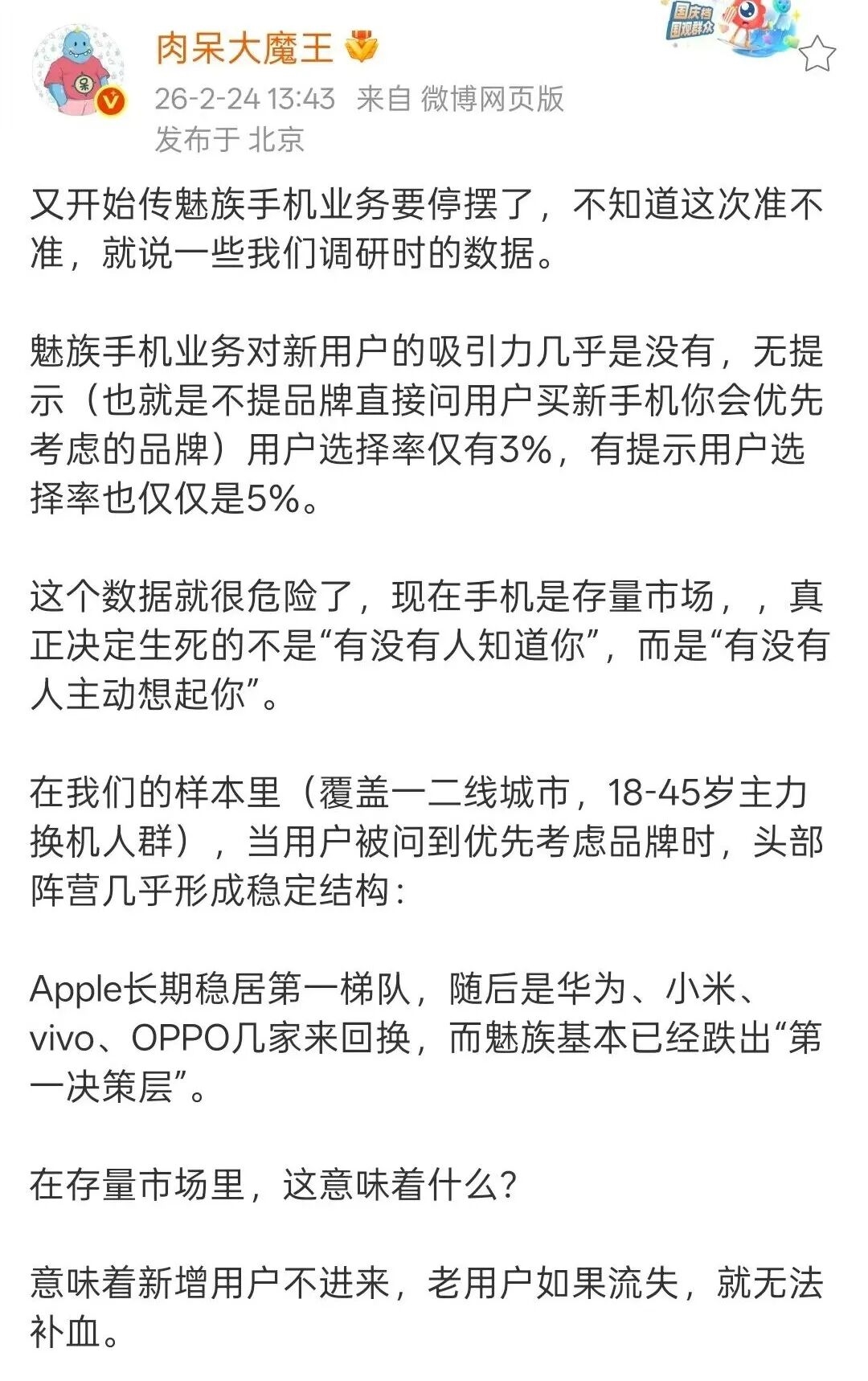 微博博主 @肉呆大魔王 昨天公布了他们的一份调研数据,魅族手机不光对新用户的吸引力几乎没有,老用户里也有 57% 的人表示下一部手机不会选择魅族。