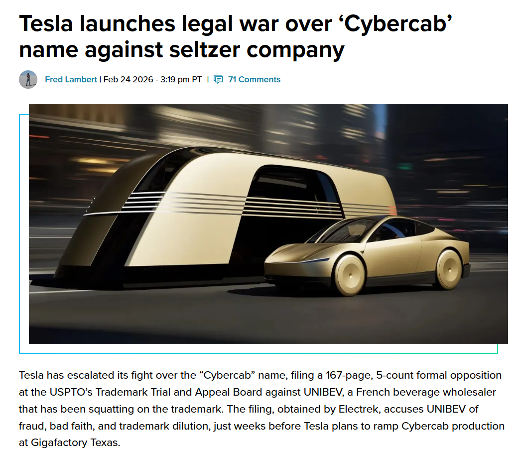 “Cybercab”作为当前特斯拉最重磅的车型之一,商标名称却在别的公司手中,特斯拉显然无法接受这样的局面。据报道,特斯拉近日已向美国专利商标局商标审判和上诉委员会提交了一份长达167页、包含5项指控的正式异议文件,状告法国饮料批发商UNIBEV,后者长期占用“Cybercab”商标。