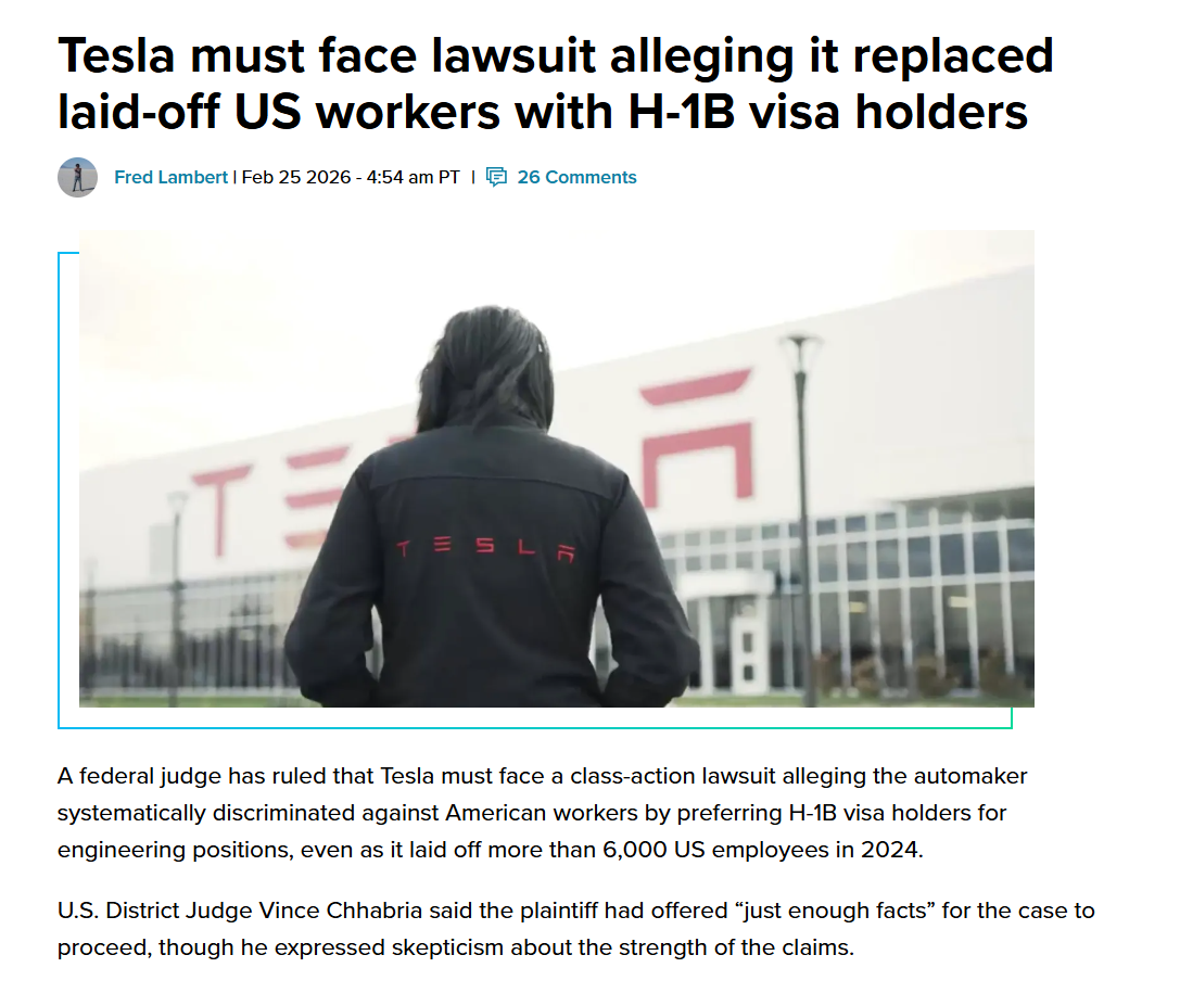 因为大范围裁员美国员工,且扩大招聘持有H-1B签证外国人的规模,特斯拉在美国又遇到了麻烦。据报道,美国一名联邦法官裁定,特斯拉需应诉一起集体诉讼。该诉讼指控这家汽车制造商在2024年解雇逾6000名美国员工的同时,在工程师岗位招聘中优先录用H-1B签证持有者,对美国本土工人实施系统性歧视。