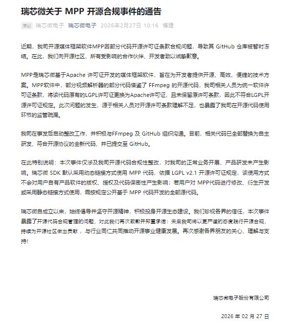 2月27日,瑞芯微发布关于 MPP 开源合规事件的通告称,近期,公司开源媒体框架软件MPP因部分代码开源许可证条款合规问题,导致其 GitHub 仓库被暂时冻结。在此,向开源社区、所有受影响的合作伙伴、开发者致歉。