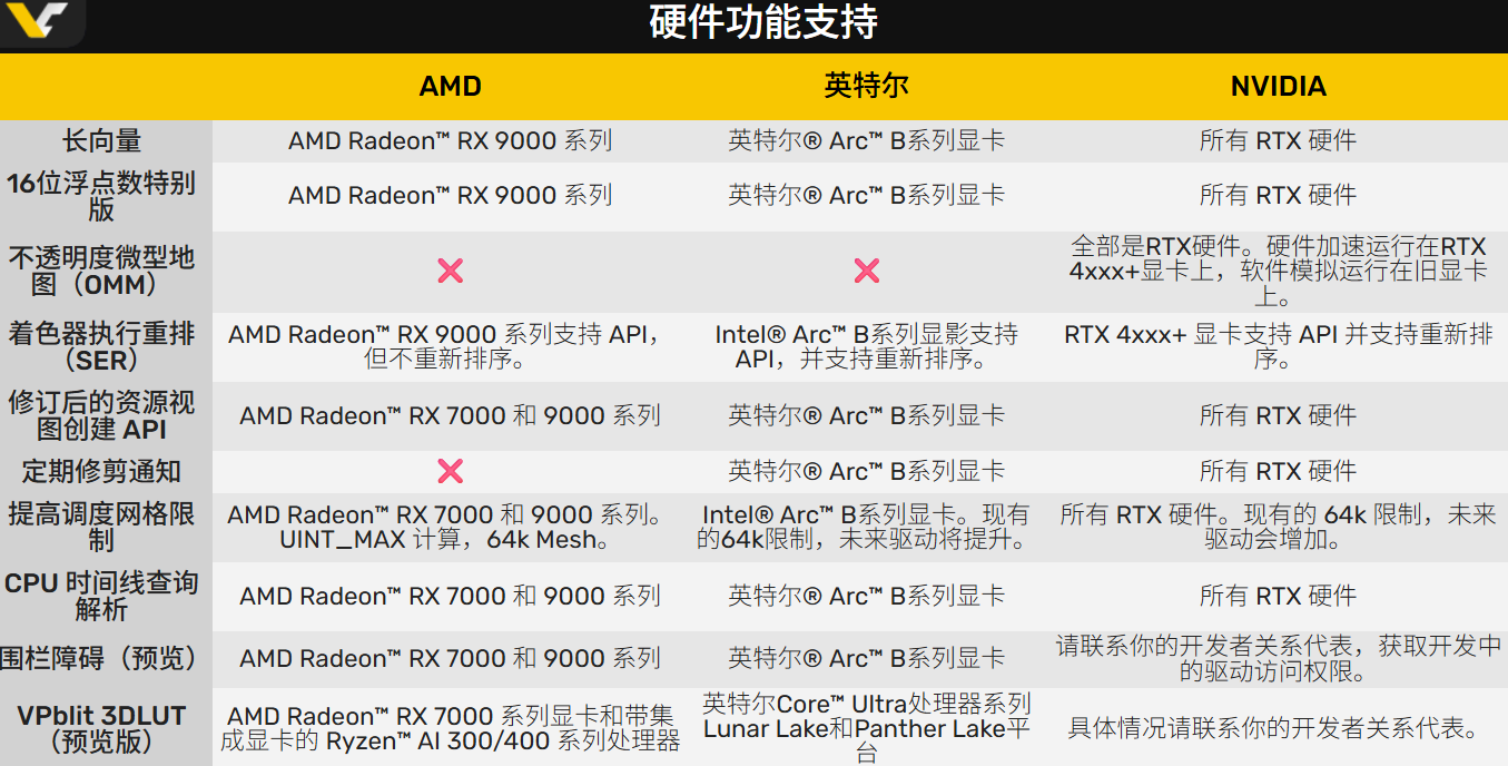 不同GPU对于DX12特性等级的支持存在很大不同,长向量、16位浮点等SM 6.9基础特性需要:AMD RX 9000系列、NVIDIA RTX系列、Intel Arc B系列。