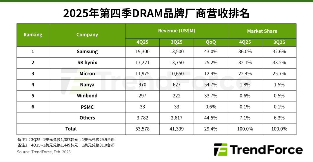 Trendforce最新报告显示,在2025年第四季,DRAM产业营收环比增长29.4%至为535.8亿美元。平均销售单价方面,一般型DRAM(conventional DRAM)合约价上涨45-50%,合并HBM的整体合约价亦上涨50-55%,所有产品合约价皆加速上涨。