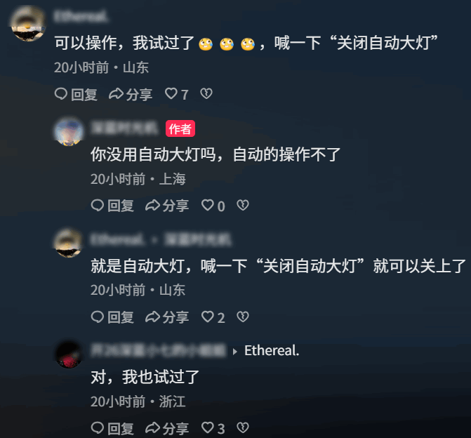 不过,另有网友在评论区指出,即便是在自动大灯模式下,语音发送“关闭自动大灯”的指令,车辆同样能够关灯,多位网友均认同了这一说法。