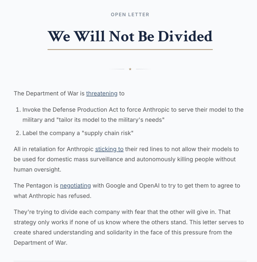 就在昨天,国防部长Pete Hegseth要求Anthropic放开Claude在军方的“所有合法用途”,否则可能动用《国防生产法》强制配合,或将其列为“供应链风险”,从而在事实上拉黑。