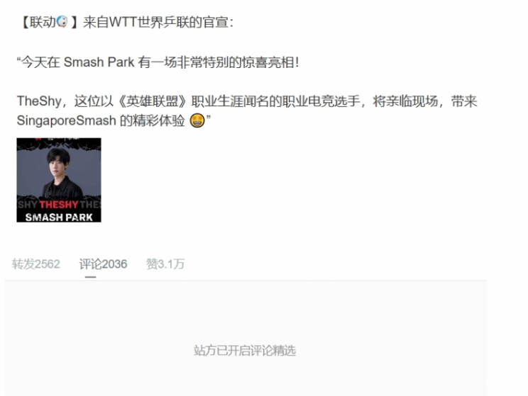 近日,知名电竞选手TheShy受邀出席WTT新加坡大满贯赛事,作为嘉宾亮相现场。官方发文称:“新加坡大满贯赛场迎来一位超级重磅嘉宾——传奇电竞选手、前《英雄联盟》职业选手TheShy惊喜现身,亲临现场感受新加坡大满贯的独特魅力。”