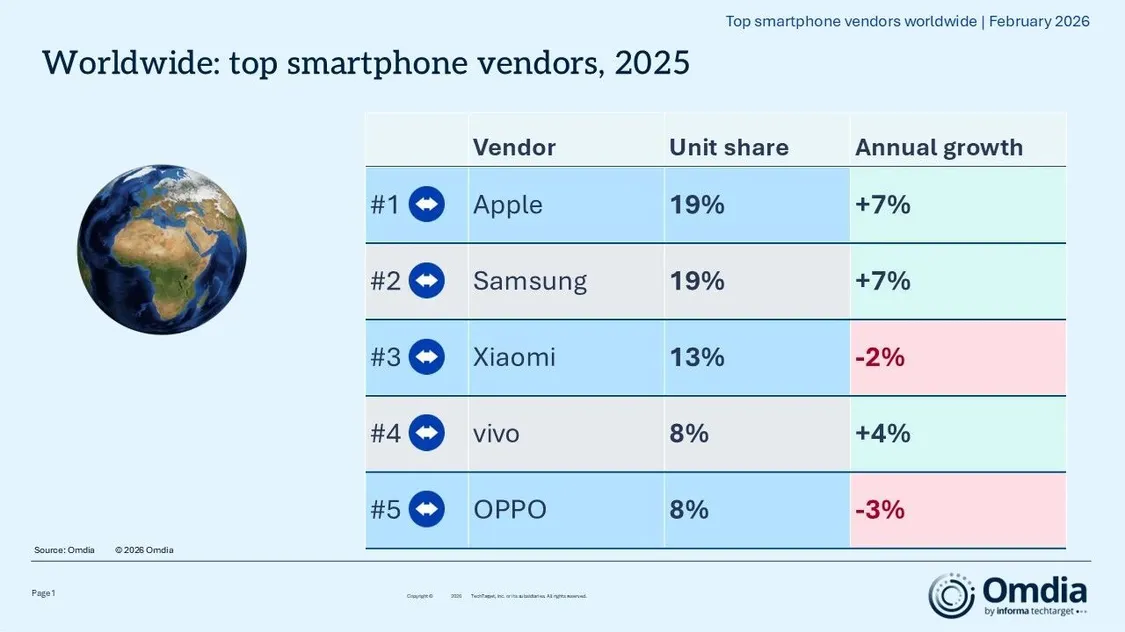 Omdia:2025年全球智能手机出货量增2% 至12.5亿部 苹果蝉联第一