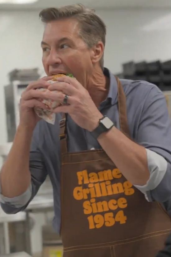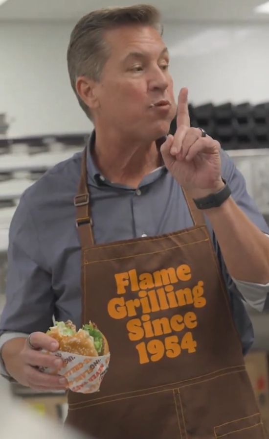 3月2日,汉堡王在TikTok平台发布一段视频,主角正是其美国及加拿大区总裁汤姆·柯蒂斯。视频中,柯蒂斯身着印有“自1954年火焰烧烤”字样的围裙,在厨房里拿起一个刚出炉的皇堡,毫不犹豫地狠狠咬下一大口,咀嚼得津津有味,嘴角沾有酱料也毫不在意,还自然地对着镜头调侃“就差一张餐巾纸了”,全程自然松弛,完全是享受美食的状态。