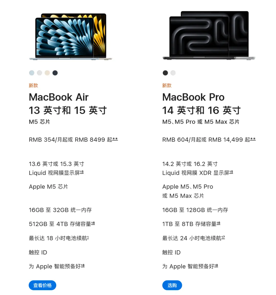 14英寸机型可选配M5、M5 Pro或M5 Max芯片,16英寸机型可选配M5 Pro或M5 Max芯片。M5 Max芯片的GPU还分为32核和40核不同版本,库克这刀法,真的切麻了。