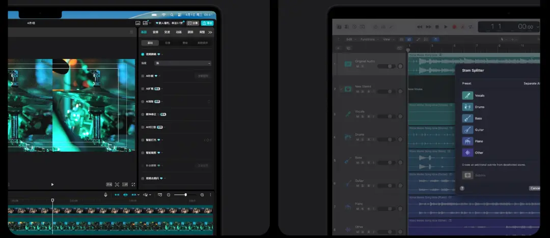 在官网案例中,苹果提到了Msty Studio、LM Studio这些大语言模型App,App中的AI工具也可以在芯片加持下获得更好体验,比如Logic Pro中的大分轨拆分器AI功能。
