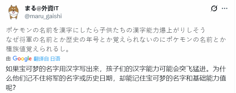 甚至还有人脑洞大开地表示,如果宝可梦的名字都用汉字书写,说不定反而能帮助孩子学习汉字。“孩子们记不住历史年份和将军名字,却能记住宝可梦名字和基础属性,这也太神奇了。”一位网友笑称。