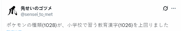 有日本网友发现一个有趣的巧合:当第十世代登场后,宝可梦的总数量将超过了日本小学生在小学阶段必需学习的基础汉字数量——1026个。
