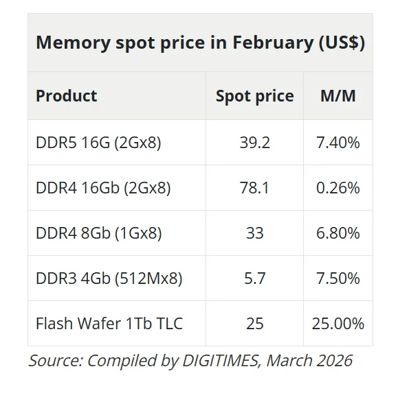 2月中旬春节假期短暂冷却交易活动,节后现货市场迅速反弹,DigiTimes指出,DDR4涨幅较1月20-30%的月度增幅有所回落,但这"仅是季节性因素,而非结构性压力缓解的信号"。