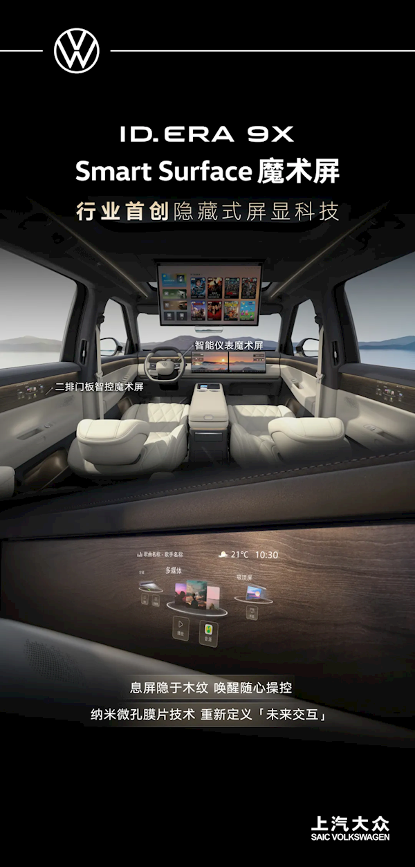 此外,该车首次搭载Smart Surface魔术屏技术,其采用微孔膜片工艺,在屏幕关闭时与内饰材质完美融合,实现“只见材质不见屏幕”的隐形式美感,点亮后画面清晰通透,无纹理干扰。