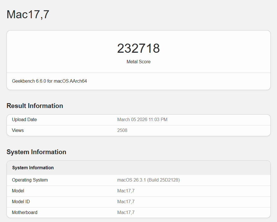 还有个坏消息,M5 Max CPU性能彪悍,GPU性能却表现平平,GeekBench 6 Metal下计算跑分只有232718,比上代提升13.8%。