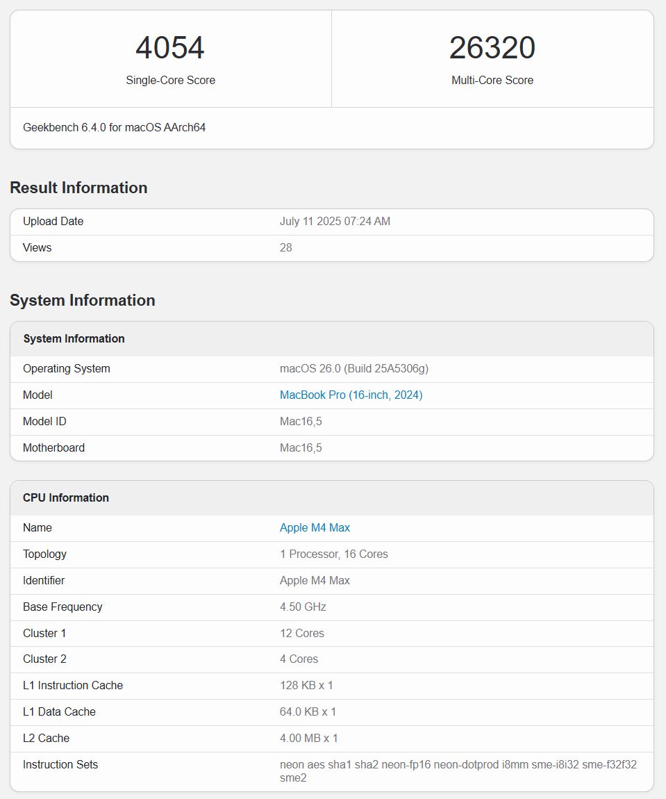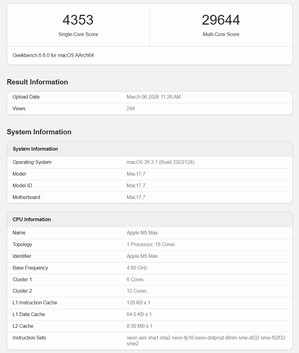 GeekBench 6数据库显示,18核心的M5 Max单核跑分4353、多核跑分29644,对比14核心的M4 Max分别高了7.4%、12.6%,对比32核心的M3 Ultra也分别高出34.4%、7.6%,后者可是之前苹果多核性能的巅峰之多。