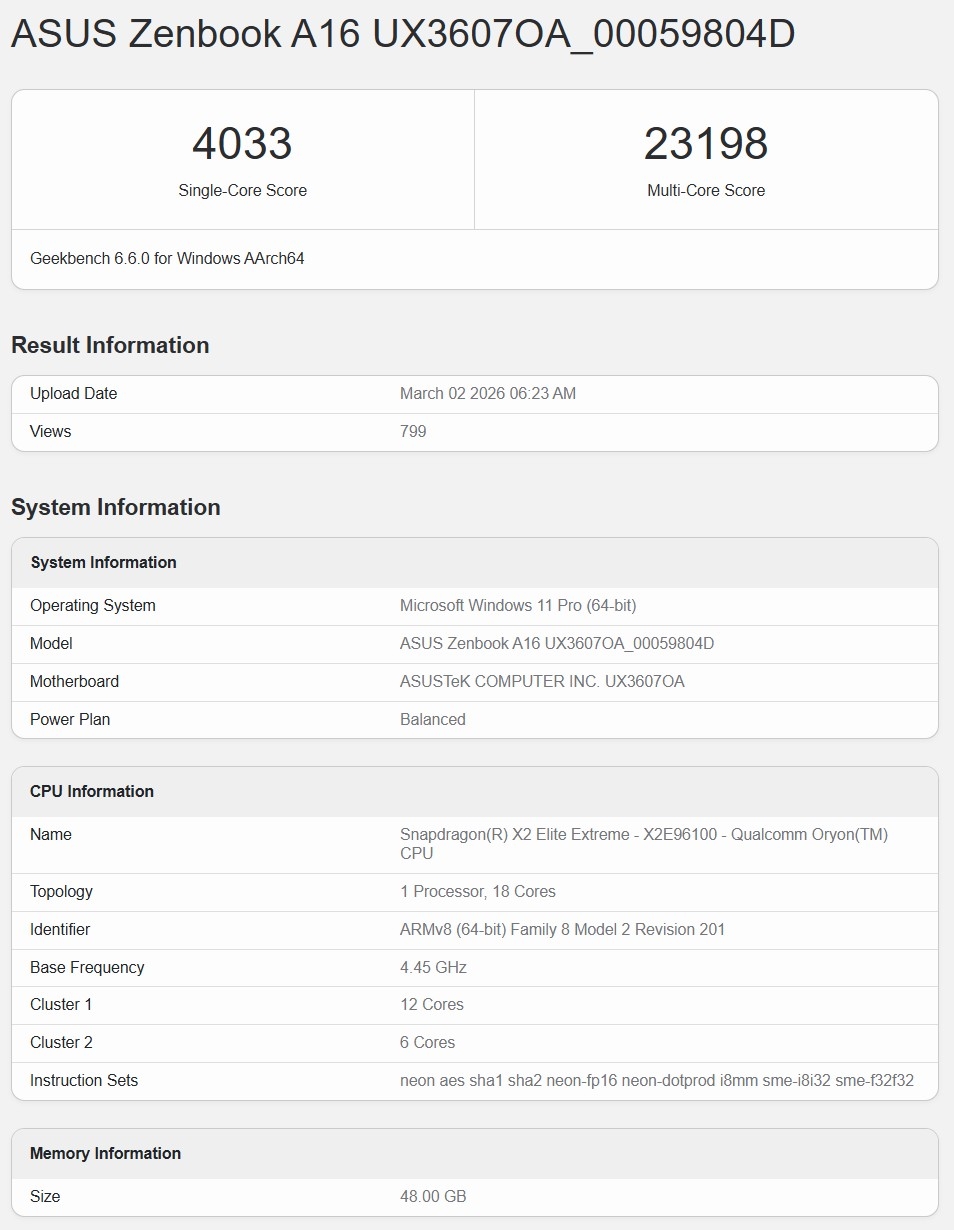 高通最新的骁龙X2 Elite Extreme处理器,规格提升至18核CPU,单核与多核性能均有明显提升,然而在与苹果最新M5系列的正面交锋中,这款Windows笔记本芯片仍未能扭转劣势。根据Geekbench 6的最新跑分显示,搭载于华硕Zenbook 16 A16机型中的骁龙X2 Elite Extreme单核得分为4033,多核得分为23198。