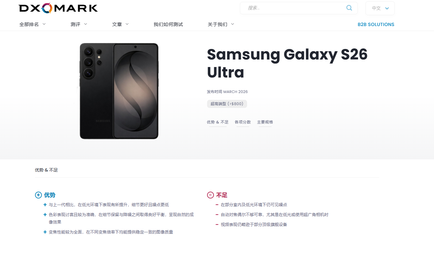 DXOMARK指出,在实验室测试与真实场景样张对比的双重评估下,三星S26 Ultra整体表现稳健。
