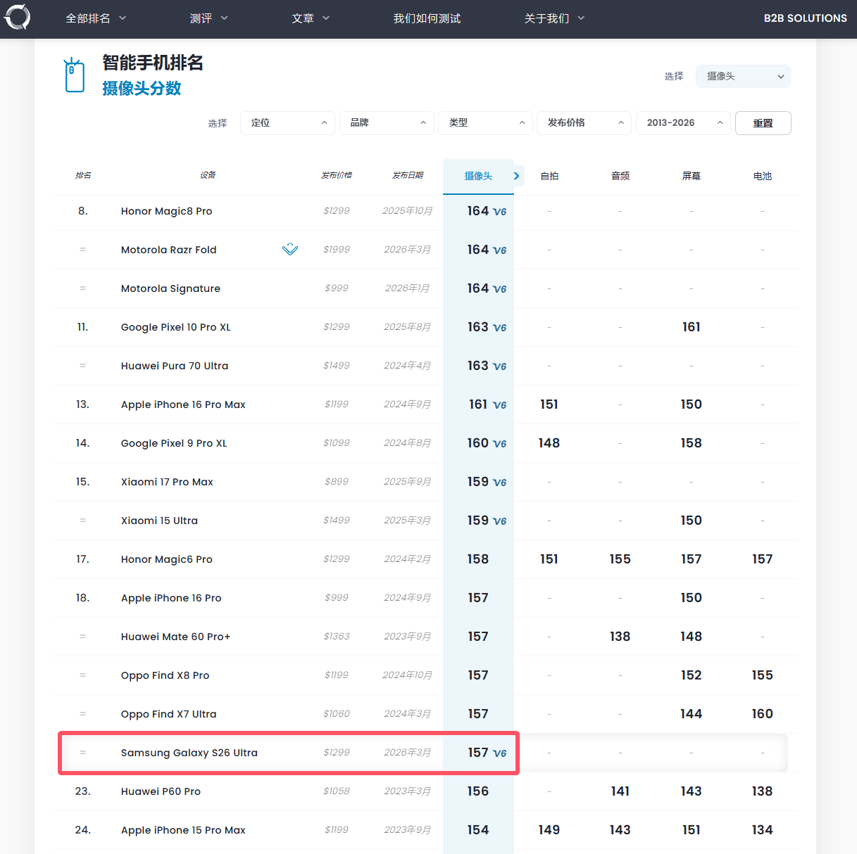 三星Galaxy S26 Ultra DXO影像得分157:全球第18 不敌小米17 Pro Max