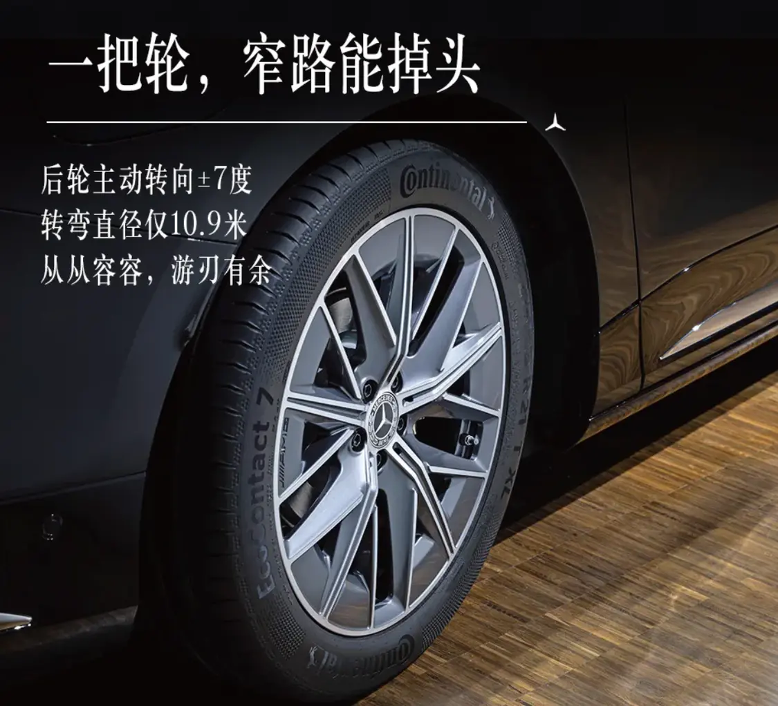 底盘方面,车辆配备AirMatic空气悬架和后轮转向系统,后轮最大转角为7度,使转弯半径达到5.45m,与CLA相当。