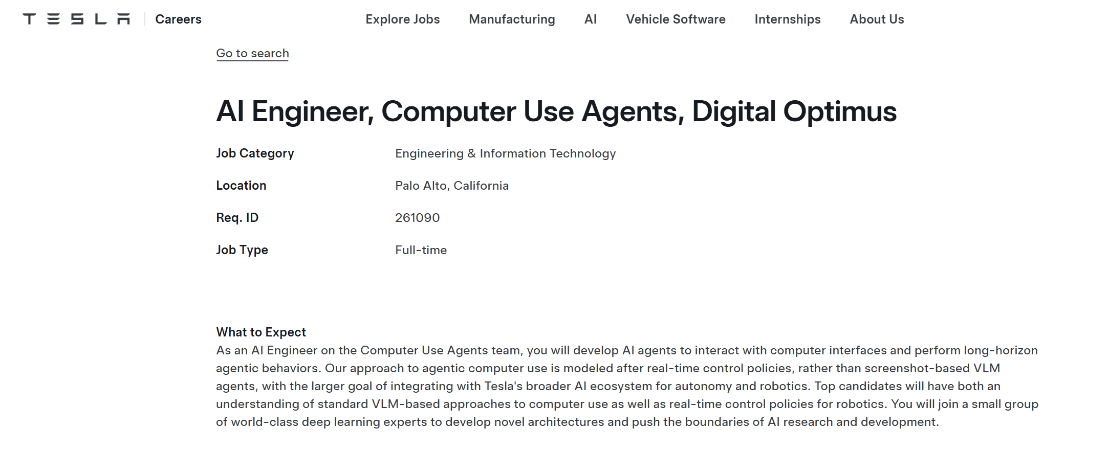 特斯拉的招聘网页也显示,今年2月出现了一个AI工程师的岗位,核心岗位描述就是开发“能使用电脑的AI代理”——能够执行“自主软件交互、代码生成和实时决策”等任务。