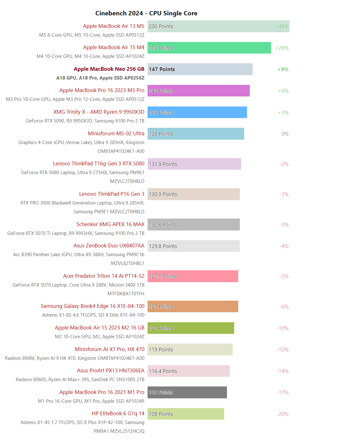 苹果最新推出的入门级笔记本电脑MacBook Neo,正以一种近乎“戏耍”的姿态来面对竞争对手。根据Notebookcheck的测评,这款搭载A18 Pro手机芯片的设备,在基准测试中超越了AMD、Intel和高通的移动平台竞品,甚至让部分桌面级处理器也望尘莫及。