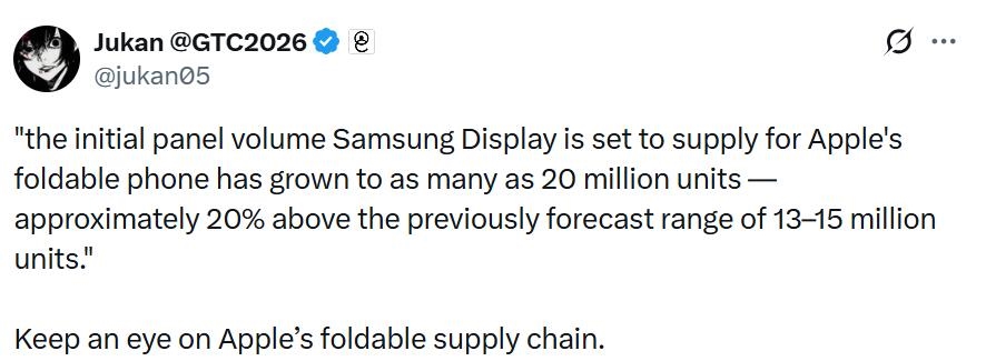 根据供应链消息,三星为苹果首款折叠屏iPhone Fold供应的首批面板订单数量出现了显著增长。目前订单量已增至2000万片,比之前预测的数值高出约20%。