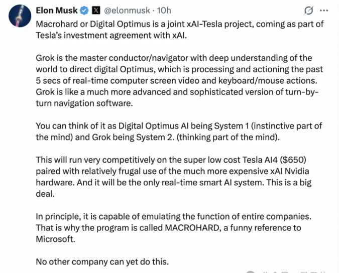 埃隆·马斯克宣布启动一项名为“数字擎天柱”(Digital Optimus)/“巨硬”(Macrohard)的创新项目。该项目由他旗下的xAI与特斯拉公司联合开发,目标是打造一个能够操控计算机、自动执行任务的“AI数字员工”。