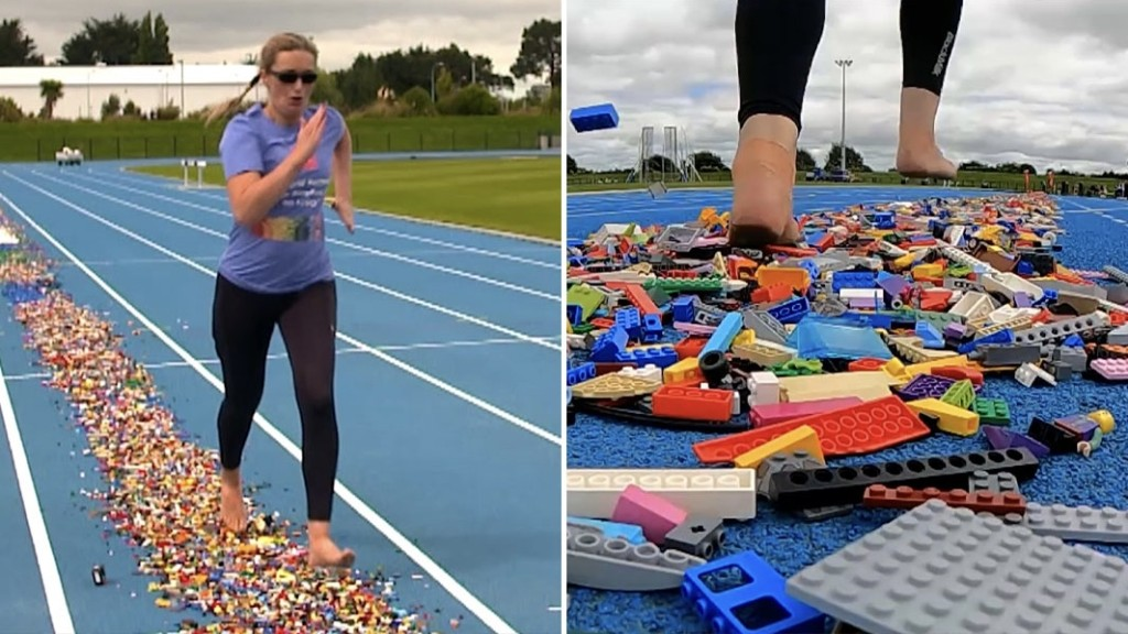赤脚在乐高积木上跑100米最快纪录”:新西兰人加布里埃尔·沃尔,在100米赛道上铺满了661磅乐高积木,然后赤脚跑出24.75 秒成绩。
