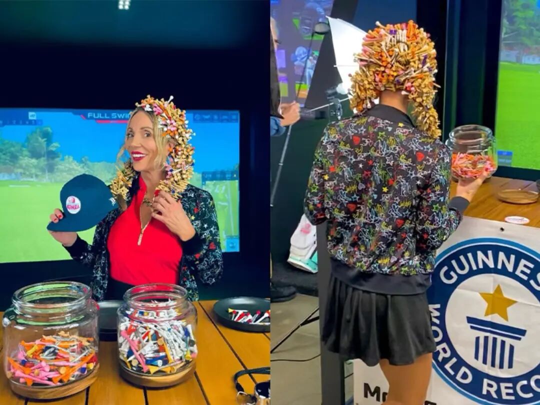 头发上插高尔夫球座数量最多纪录”:美国女子安雅·班纳什扎着麻花辫,在2个朋友的帮助下,在头发里插了711个高尔夫球座,2024年获得吉尼斯纪录。