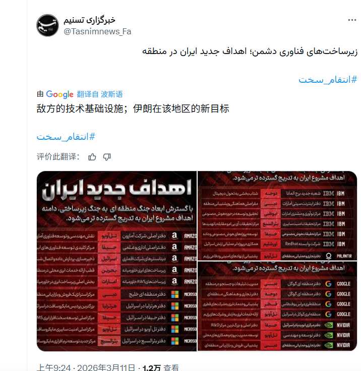 该媒体在X网站上发文称,亚马逊、微软、谷歌、甲骨文、英伟达、IBM和Palantir等公司在中东约30个地点的资产已成为伊朗在该地区“新的目标”。该消息称,这些地点已被认定为“敌方技术基础设施”。