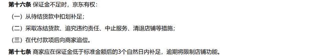 但根据京东开放平台商家保证金管理规则,未足未足额缴纳保证金的,京东有权采取限制货款提现、限制商品发布、限制营销推广功能、搜索推荐降权、限制对应品牌商品上架以及其他必要措施等一项或多项限制。