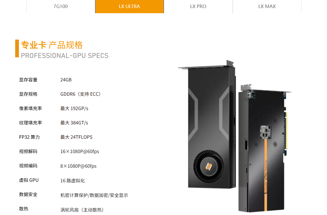 LX Ultra面向服务器/机架式一体机,配备24GB GDDR6显存,支持ECC内存纠错,像素填充率最大192 GP/s,纹理填充率最大384 GT/s,FP32算力最大24 TFLOPS。支持16×1080P@60fps视频解码,8×1080P@60fps视频编码。同时支持16路虚拟化GPU,机密计算保护/数据加密/安全系那是,采用涡轮式散热器。