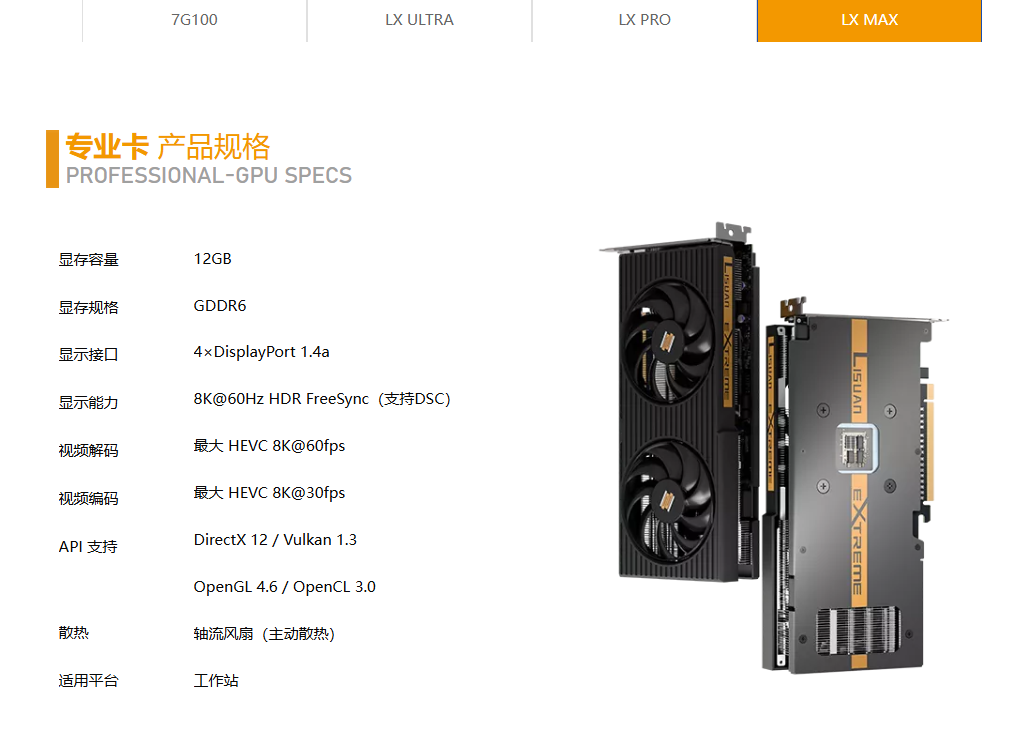 在AWE2026大展公开发布之后,砺算科技更新了其官方产品页面,并展示了 Lisuan eXtreme LX系列GPU——LX 7G100游戏显卡以及LX Ultra、LX Pro和LX Max三款专业卡的详细规格和设计细节。