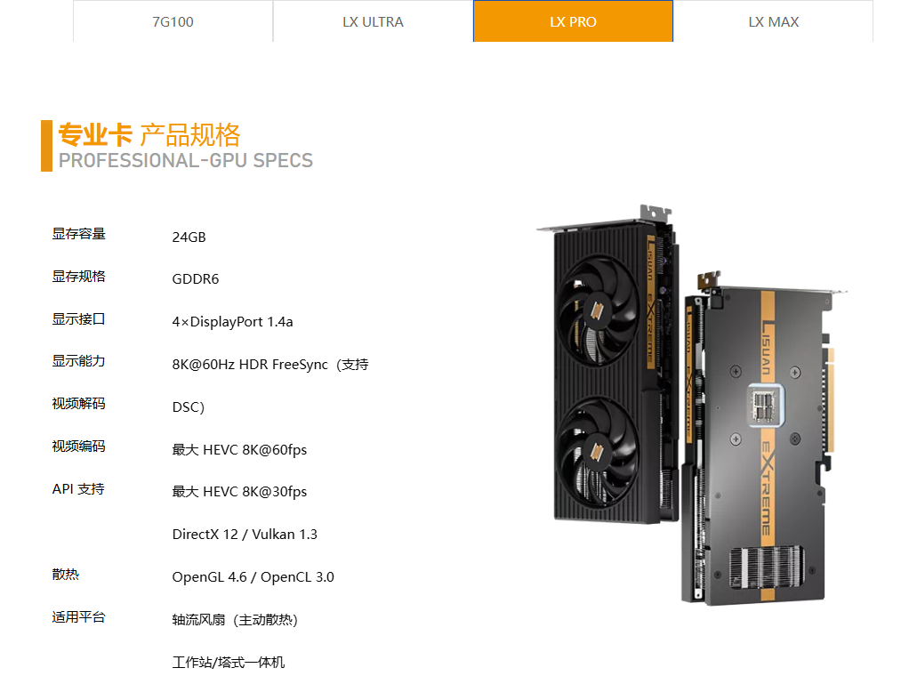 LX Pro和LX Max的功能配置更为接近,两者均配备四个DisplayPort 1.4a 输出接口,支持8K@60Hz HDR FreeSync和 DSC,支 HEVC 8K@60fps视频编码,并兼容DirectX 12、Vulkan 1.3、OpenGL 4.6和OpenCL 3.0。LX Pro配备 24GB GDDR6 显存,主要面向工作站塔式机箱;而LX Max则配备 12GB 显存,适用于一般工作站。两款显卡均采用轴流式散热。