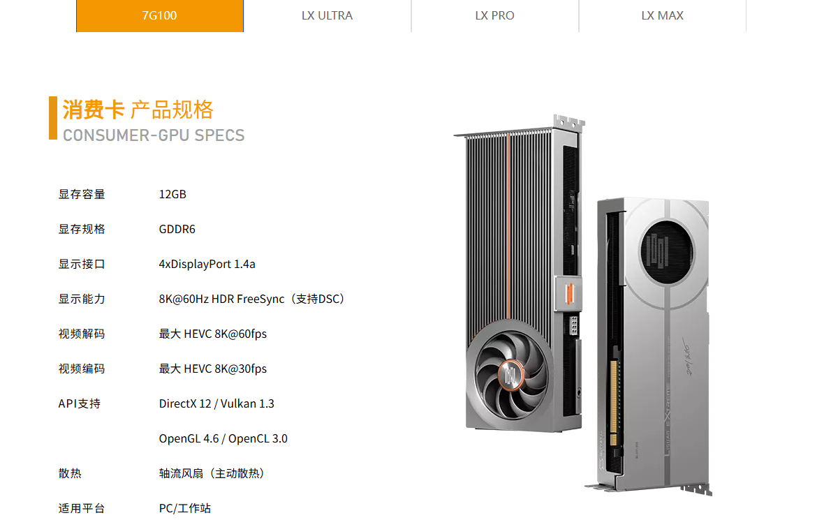 其中,面向消费者的LX 7G100游戏显卡核心规格与此前公布的相同:12GB GDDR6显存、192个纹理单元(TMU)、96个光栅化单元(ROP)、PCIe 4.0 x16插槽,以及通过单个8针电源接口提供最高225W的板载供电。
