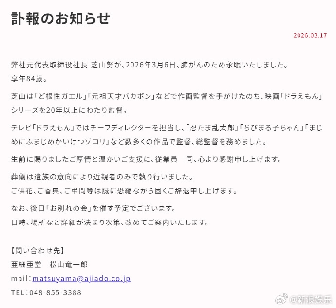 据新浪娱乐报道,日前,日本动画制作公司亚细亚堂发布讣告称,知名导演芝山努于2026年3月6日因肺癌逝世,享年84岁。据介绍,芝山努是1979年版《哆啦A梦》首席导演、编剧,连续执导《哆啦A梦》系列22部剧场版,从《大雄的海底鬼岩城》到《大雄的猫狗时空传》。