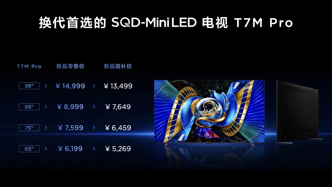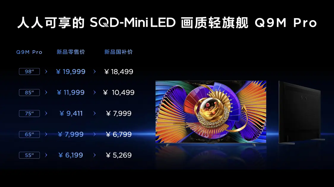 Q9M Pro定位轻旗舰,最高搭载3552个万象分区,采用全链路控光方案,官方称其分区效果相当于10656个分区的RGB电视。屏幕采用超级蝶翼星曜屏,配合高浓度极彩量子晶体,实现100% BT.2020全局高色域,色点准确性提升69%。峰值亮度达5000nits,搭载TSR AI光色同控芯片。提供55/65/75/85/98英寸五个尺寸,国补后最低售价进入五千元档。