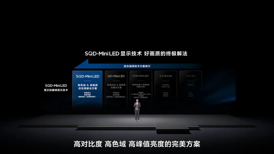 TCL在发布会上提出“画质铁三角”概念,认为好画质取决于对比度、色域和峰值亮度三个核心指标。SQD-Mini LED技术通过极致控光、全局高色域和极致亮度实现三者统一。该技术此前已获中国视像协会科技创新奖、CES 2026创新显示技术金奖及AWE 2026艾普兰金奖。