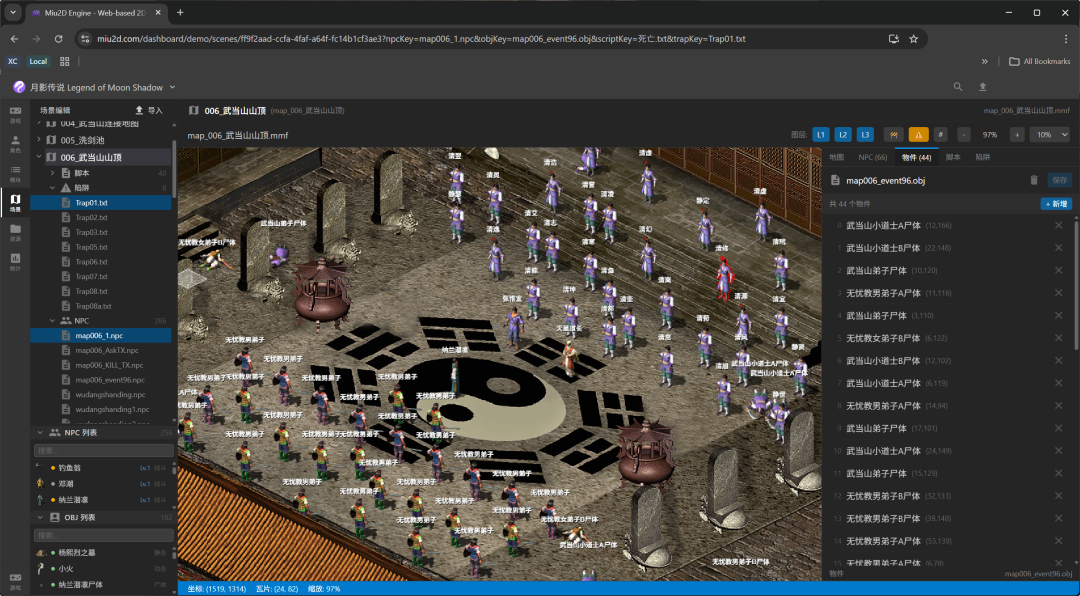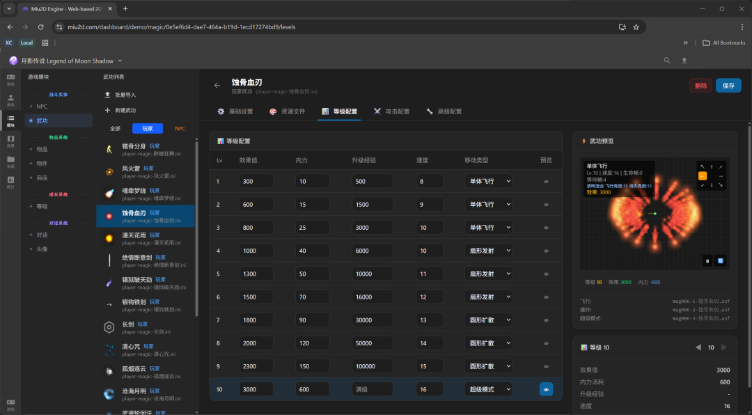 武功、NPC、地图、物品、对话树,13 个模块全能在网页上直接编辑,改完刷新就能在游戏里看到效果。以后只要把引擎接入 AI,用户就能一句话生成游戏剧情和 MOD 了。