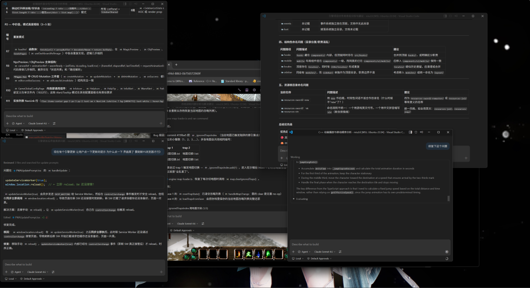 有一次做寻路系统,陈老师觉得这个模块太吃性能,TypeScript 可能扛不住,就让 Sonnet 试试用 Rust 重写。Sonnet 写完之后自己跑了一轮性能对比,发现 Rust 和 TypeScript 之间来回翻译传递数据的开销太大,总体算下来反而更慢了。