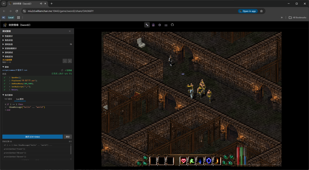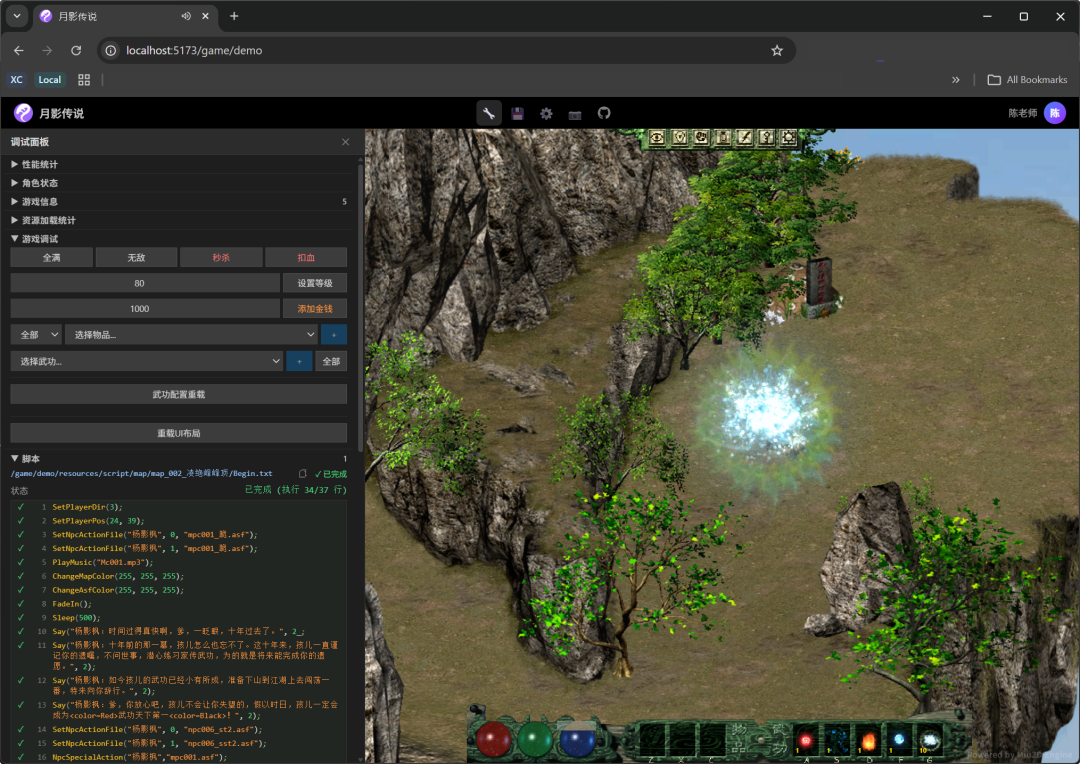 由于原版游戏是西山居用自创的脚本语法把整个剧本串起来的,为了让游戏在浏览器里跑起来,陈老师还把上百种剧情指令全部重写了一遍,并且加入了现代游戏行业通用的 Lua 语言支持,以后想给游戏加新剧情、改对话分支,不用去琢磨西山居独创语法,用 Lua 脚本就能成。