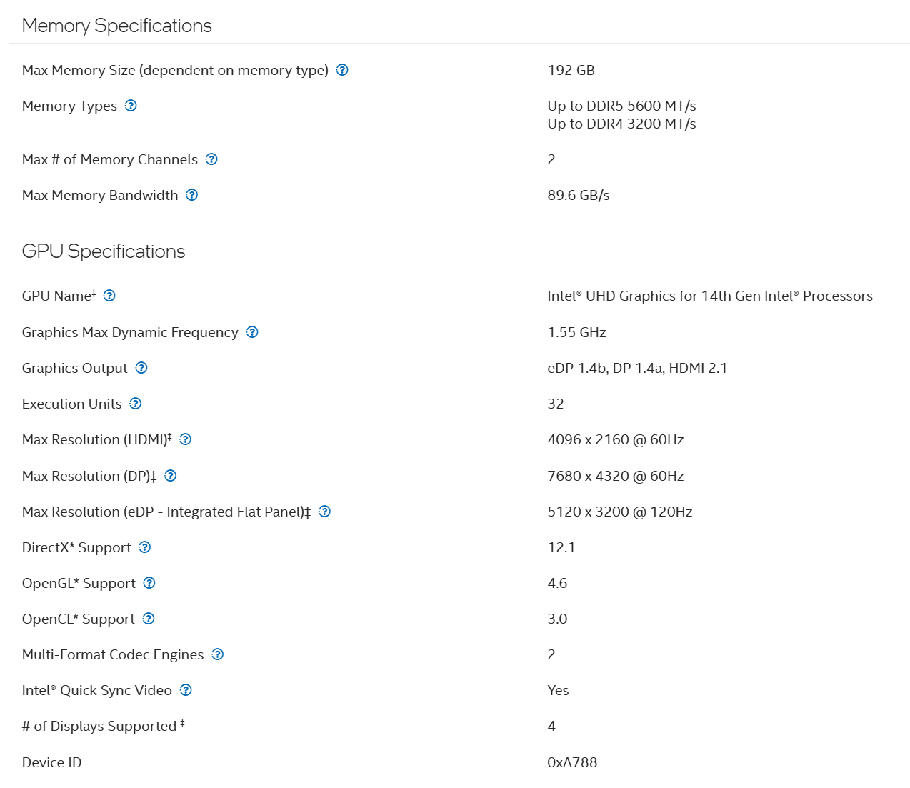再往上还有个酷睿i7-13700HX,整体规格自然更高,比如8P+8E 16核心24线程、三级缓存30MB、最高睿频5.0GHz,但核显也是32单元、1.55GHz,内存也仅支持到DDR5-4800。