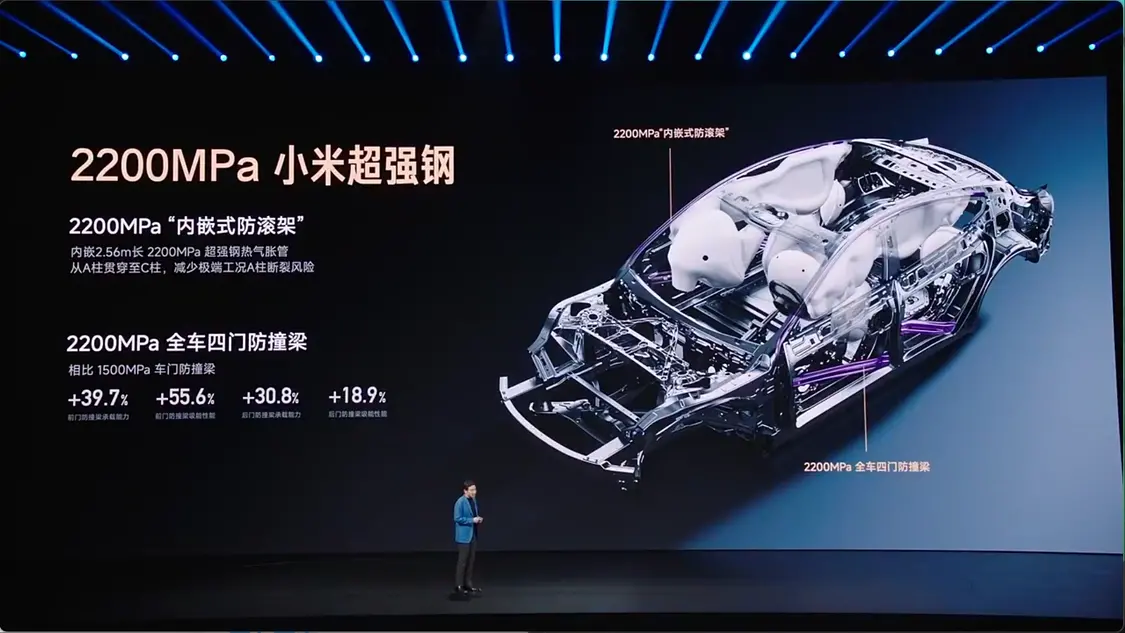 安全性与市场推广方面,新车采用高强钢和铝合金占比达90.3%的车身,关键部位使用2200兆帕超强钢,全系标配9个安全气囊并新增后排侧气囊。电池包具备17层高压绝缘防护及底部1500兆帕防刮底横梁。此外,发布会上正式宣布演员舒淇与运动员苏炳添出任小米汽车品牌代言人。