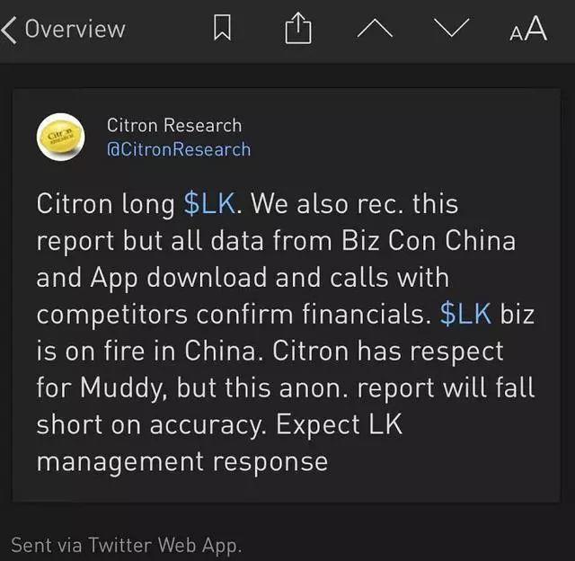 除了媒体评论,针对瑞幸咖啡被做空一事,另一家做空机构Citron Research(香橼)也发布了与浑水公司相左的意见。
