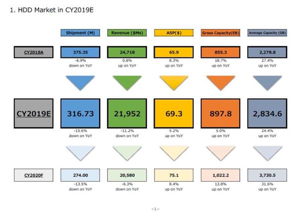根据他们的报告,2018年全球HDD硬盘出货量降至3.735亿块,同比下滑了6.9%,2019年预计只有3.16亿块,下滑15.6%,预计2020年将跌至2.74亿块,实现五连跌。