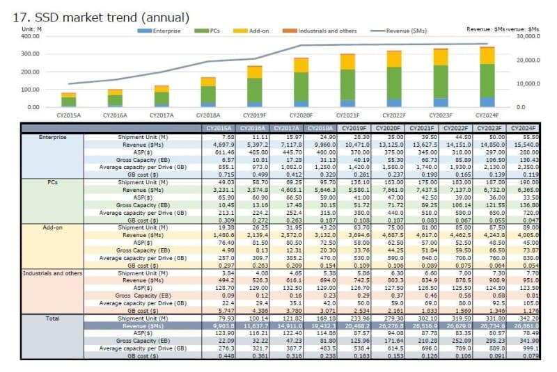 跟HDD硬盘一样,衡量SSD硬盘也涉及到了出货量、营收额、ASP均价、总数据容量、平均容量、每GB价格等。