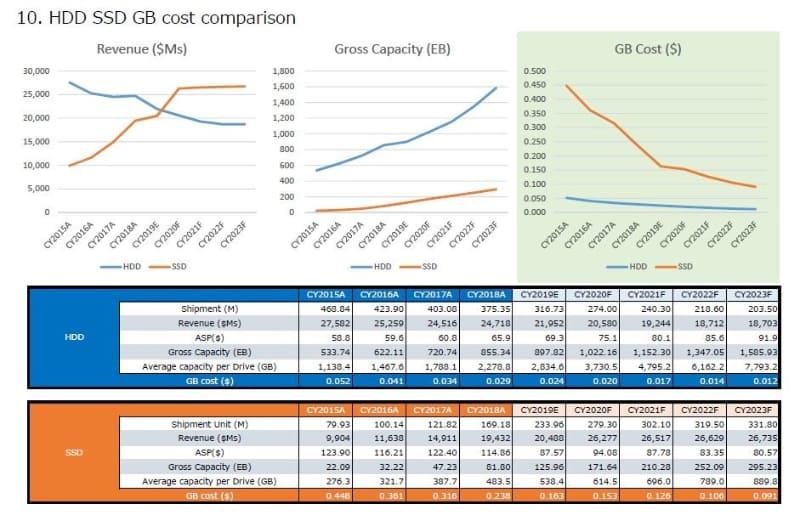 每GB价格倒是一直在降低,2018年是0.238美元,2019年是0.163美元,这两年都有明显下降,2020年则是0.153美元,降不多了,因为今年又要涨价了。